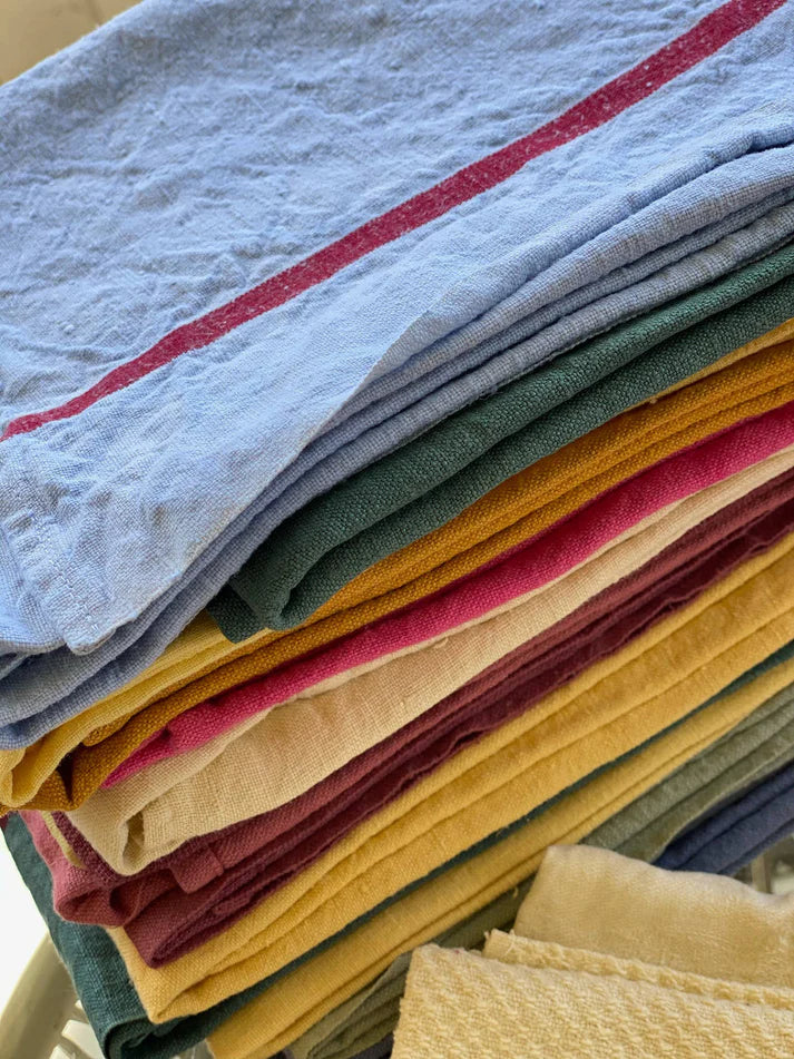 Maison Masarin carefully sources, dyes, and restores these vintage tea towels in their atelier in Lyon, France, ensuring each one retains its original charm. Crafted from natural fibres such as linen, hemp, or cotton, each towel undergoes a thoughtful process of cleaning, repair, and restoration to ensure exceptional quality.