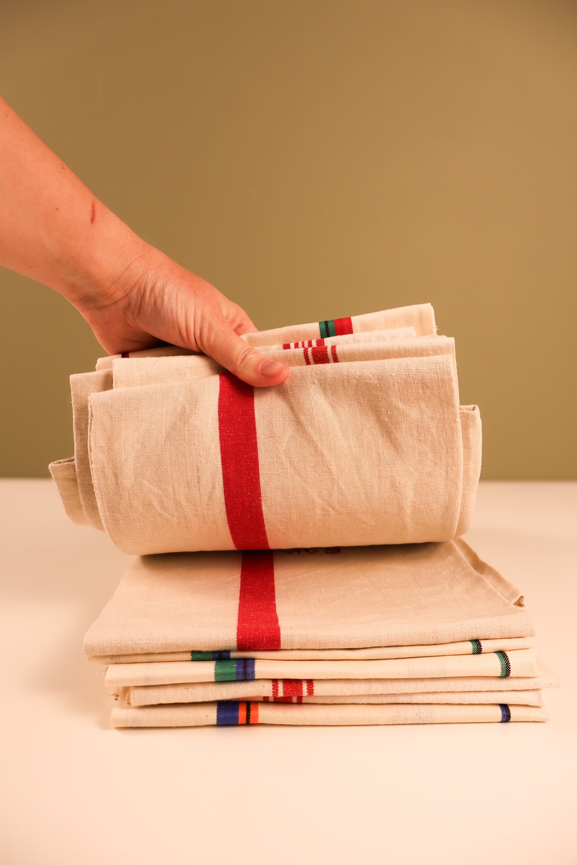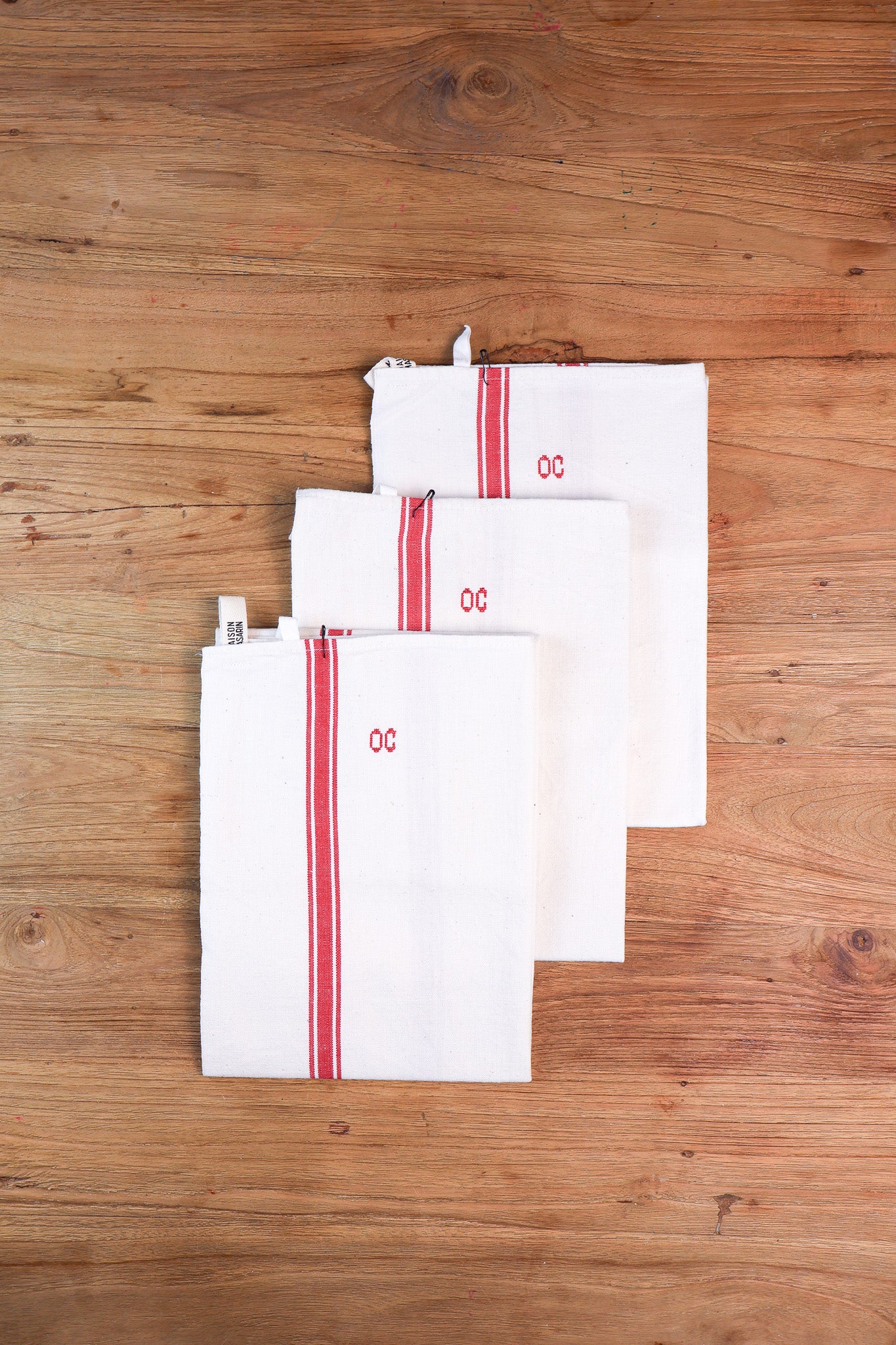 Maison Masarin carefully sources, dyes, and restores these vintage tea towels in their atelier in Lyon, France, ensuring each one retains its original charm. Crafted from natural fibres such as linen, hemp, or cotton, each towel undergoes a thoughtful process of cleaning, repair, and restoration to ensure exceptional quality.